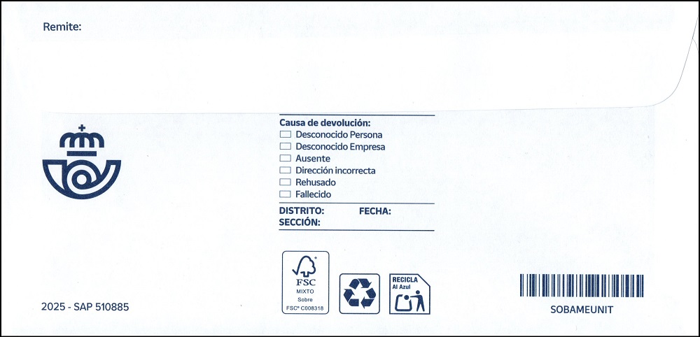 dorso '2025-SAP 510885', con Cornamusa a la izquierda y código de barras 'SOBAMEUNIT'. (Modelo Americano).
